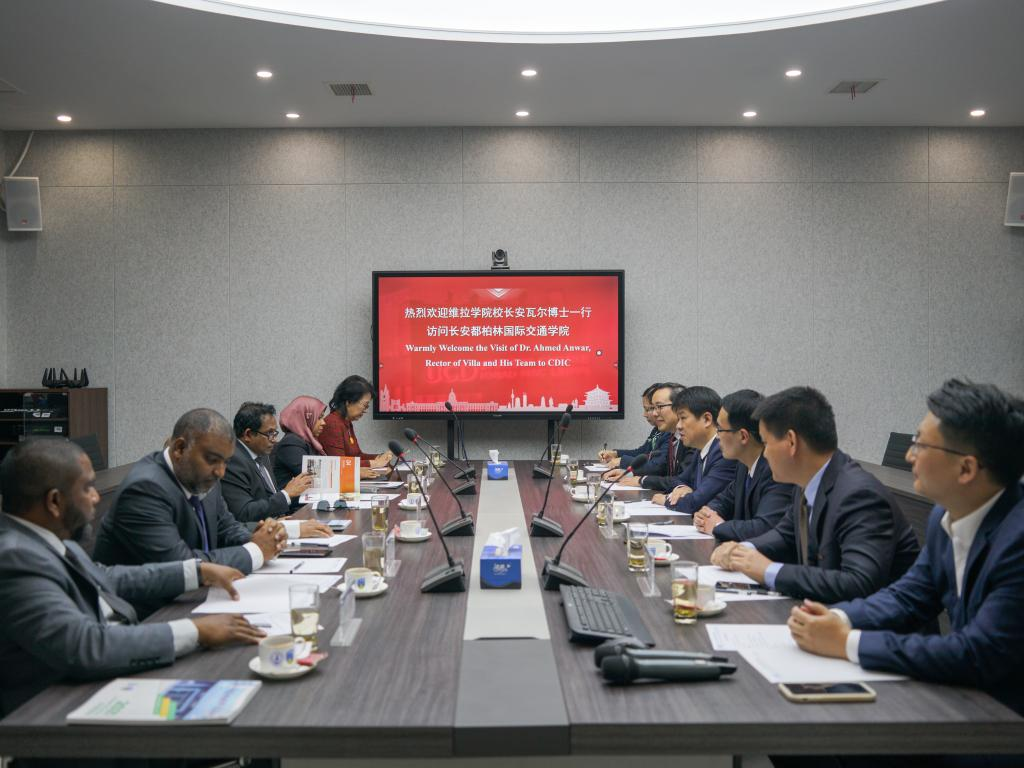 On the afternoon of March 6th, Rector of Villa College Dr. Ahmed Anwar and his delegation visited CDIC to investigate the development of Sino-foreign cooperative education. Zhang Wei, Dean of International Education School, accompanied the visit. Zhao Liang, Secretary of the General Party Branch of CDIC, Yao Yiliang, Deputy Secretary of the General Party Branch and Deputy Dean of CDIC, and Bai Qiang, Deputy Dean of CDIC attended the discussion and exchange.
