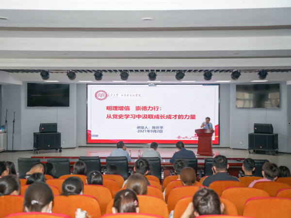 党总支邀请马克思主义学院院长陈怀平教授,开展以《明理增信崇德力行:从党史中汲取成长成才的力量》为题的党史学习教育专题讲座。学院党政领导、全体教职工以及2021级新生通过线上线下结合的形式分为三个会场共同聆听讲座。讲座由学院党总支副书记姚以亮主持。