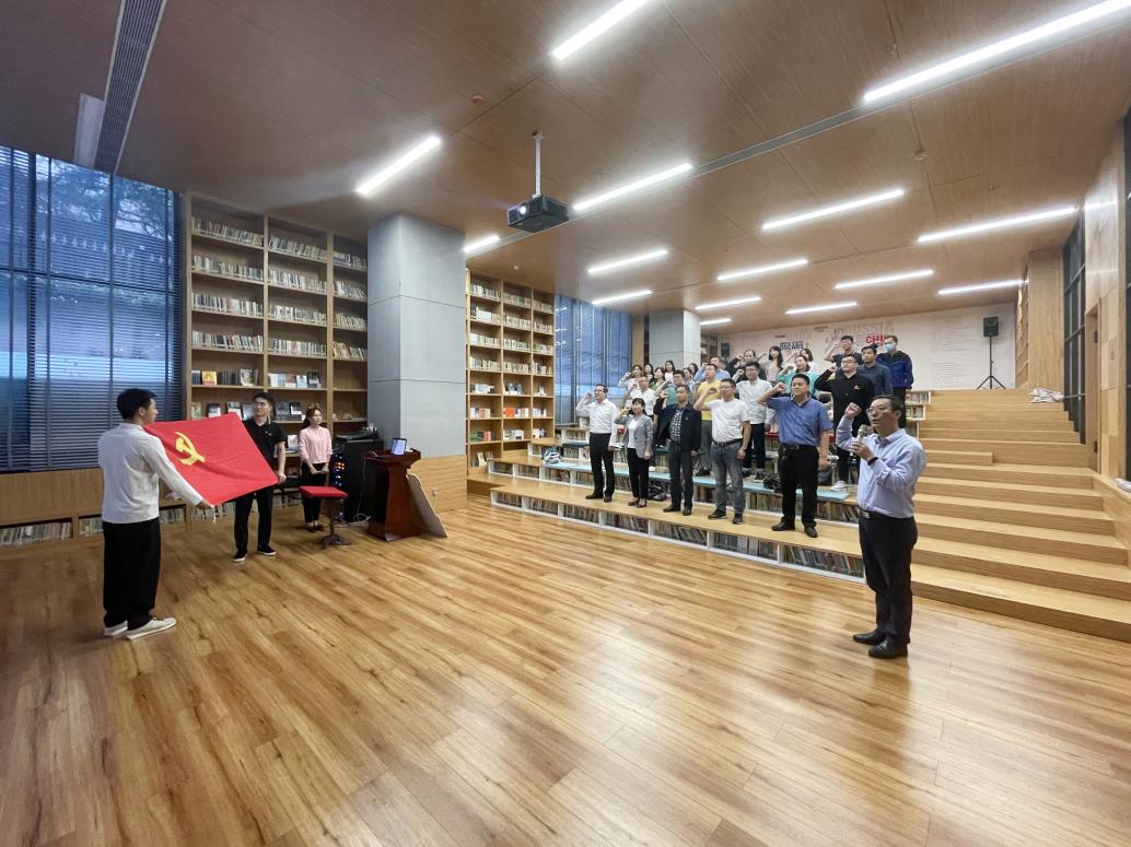 在电影党课教学现场,学院党总支书记汪海年同志带领全体党员面对鲜艳的党旗重温入党誓词。大家高举右拳,全体肃立,庄严宣誓。誓言铿锵,震撼着在场每一位党员,提醒大家在前进路上不忘初心和使命。党课学习结束后,全体学员合影留念。