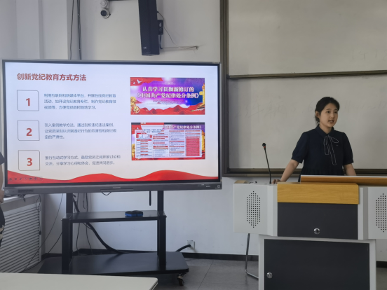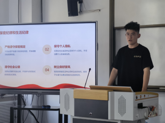 会上,周傲然同志强调了开展党纪学习教育的重大意义,他以“中国共产党对破解历史周期律的探索与实践出发”为题,领学了习近平总书记关于党的自我革命的重要思想;王骏西同志带领支部党员进行了党规党纪学习,他认真讲解了党政治纪律、组织纪律、廉洁纪律、群众纪律、工作纪律、生活纪律;叶甜伊同志通过一系列生动具体的案例,强调了遵守党规党纪的重要性,她提出大家要以案为鉴,要时刻保持清醒头脑,坚定理想信念;林晨曦同志解读了新修订的《中国共产党纪律处分条例》,教育引导全体党员准确把握新修订《条例》的深刻内涵和实践要求,树立纪律观念、强化纪律敬畏、严格纪律约束。