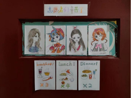 学生们收到餐后也纷纷在宿舍门口贴上送餐温馨提示,用绘画等多种形式对志愿者的服务表示感谢。
