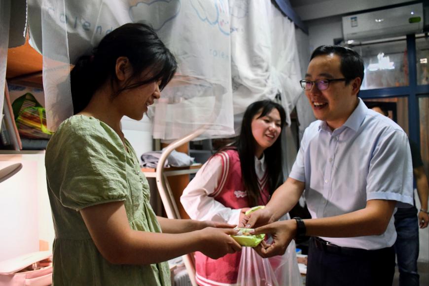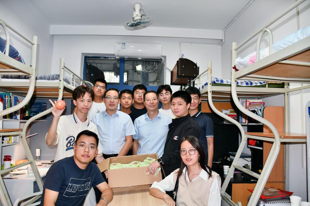 座谈结束后,学院领导一行来到学生宿舍,向同学们送上月饼、苹果等慰问品,和同学们团坐一堂,其乐融融。