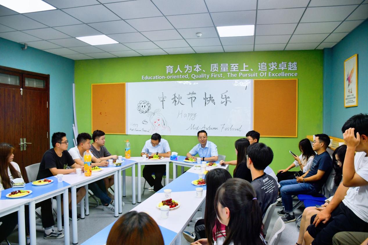洋溢着欢快的节日氛围。在中秋佳节到来之际,学院党总支书记、院长汪海年,党总支副书记、副院长姚以亮带队走访学生宿舍,看望慰问留校过节学生,并在学生宿舍楼活动室举办了师生共庆中秋主题座谈会。学生事务部主任孙士强、2021级辅导员张力雄、2018级辅导员曾妍及各年级学生代表参加座谈。