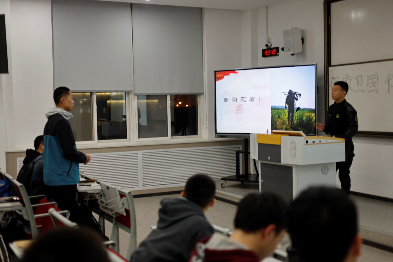 为了弘扬爱国主义精神,普及国防教育,使广大学生增强国防观念,掌握必要的国防知识和军事技能,自觉履行国防义务,关心、支持、参与国防建设,学校武装部于4月7日19时来学院开展“保家卫国你我同行”宣讲活动,我校优秀退伍大学生、弘毅中队李健进行国防安全教育和应征入伍政策宣讲。2018级辅导员曾妍和学院部分学生参加活动。本次活动由武装部国防教育科副科长刘天宇主持。