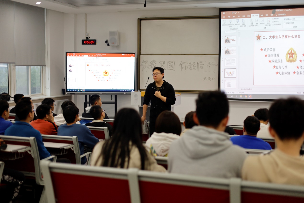 李健从部队经历、感悟和入伍号召两个方面进行宣讲。他从自身服役的伞降兵兵种入手,向同学们分享了高空跳伞和狙击训练的难忘经历。军旅生涯虽然艰苦不易,但这在李健铿锵有力的话语中却显得微乎其微,处处彰显着军人的赤诚热血。
