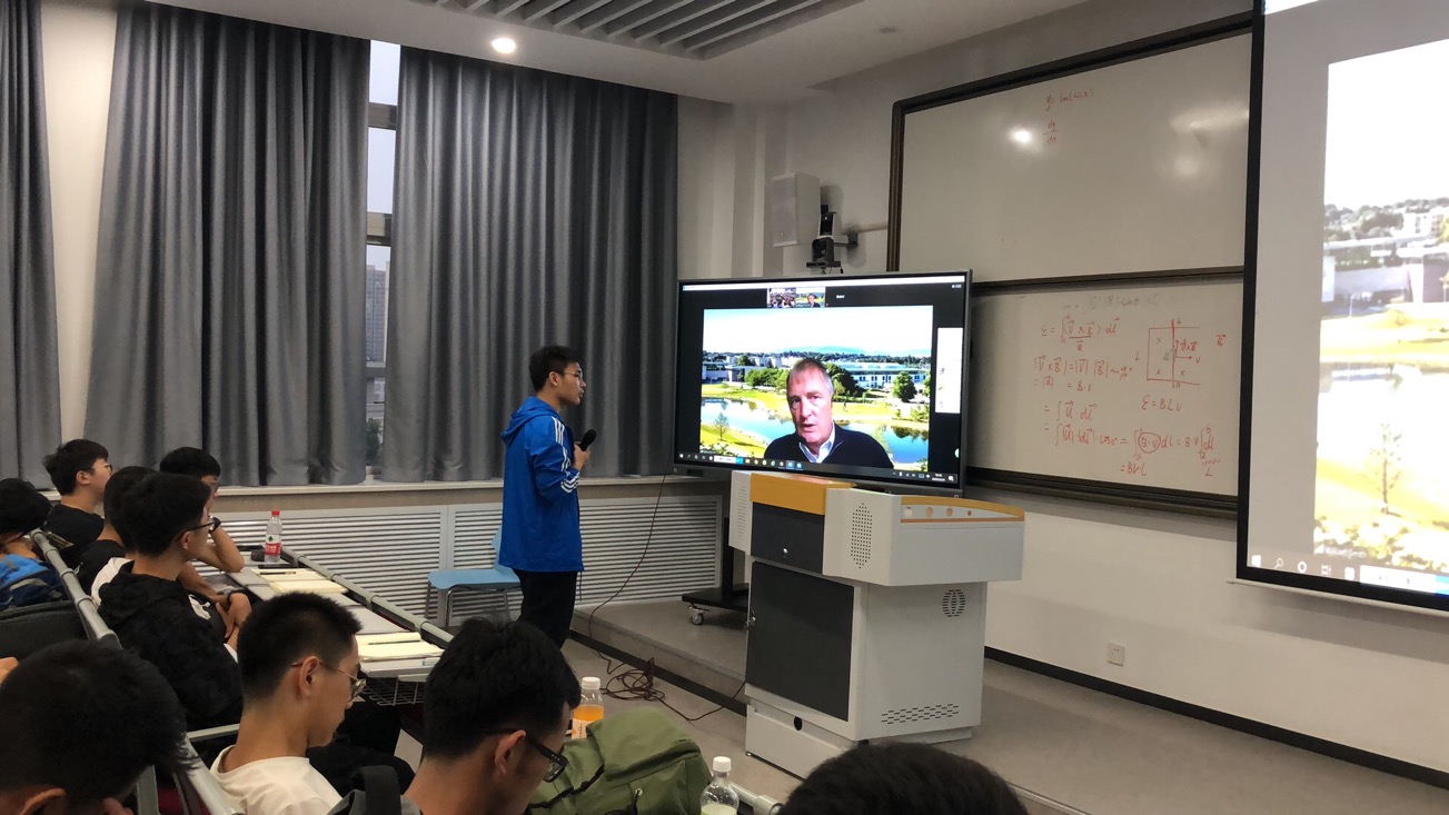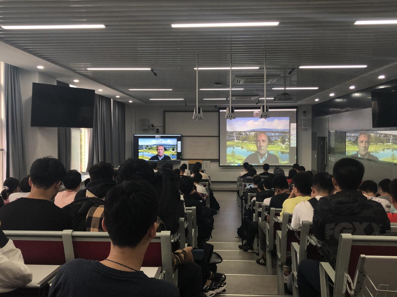 在鸿远教学楼高速网络交互式教室举办中外合作办学2020级新生都柏林大学教授讲专业活动。都柏林大学(UCD)车辆工程专业负责人WilliamSmith教授、交通运输专业负责人BrendanWilliams教授与都柏林大学(UCD)合作办学主管BeiniChen参加了本次会议。