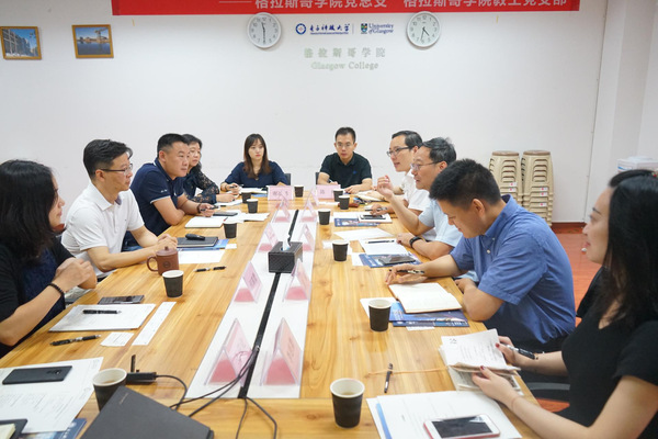 双方还就合作办学理念及运行管理经验进行了讨论并交换意见。格拉斯哥学院党总支书记高世全在座谈会前会见调研团队一行。会后,调研团队在工作人员陪同下参观了学院的办学场地及实验室,双方学院互赠纪念品并合影留念。