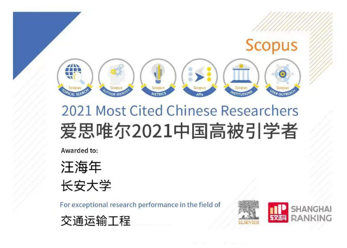 院长汪海年教授继2020年入选后,再次入选爱思唯尔 2021年交通运输工程领域“中国高被引学者”。