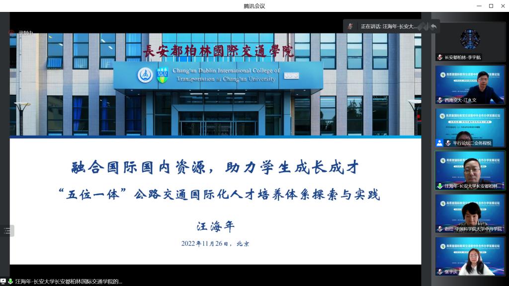 11月26日,“高质量国际教育交流暨中外合作办学发展”论坛在北京工业大学成功举办。本次线上论坛旨在深入学习贯彻党的二十大精神,积极推动国际教育交流和中外合作办学高质量发展,为中国式现代化进程培养大批具有全球视野、家国情怀,有能力参与国际竞争与合作的创新型复合人才。我校副校长范文教授应邀主持“中外合作办学人才培养与质量保障”平行分论坛,学院党总支书记、院长汪海年教授受邀作“‘五位一体’公路交通国际化人才培养体系探索与实践”专题报告。学院全体教职工线上参加本次论坛。