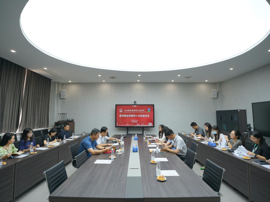 在鸿远教学楼四层会议室召开教职工交流座谈会,学院全体教职工参加座谈。会议由学院党总支书记赵亮主持。
