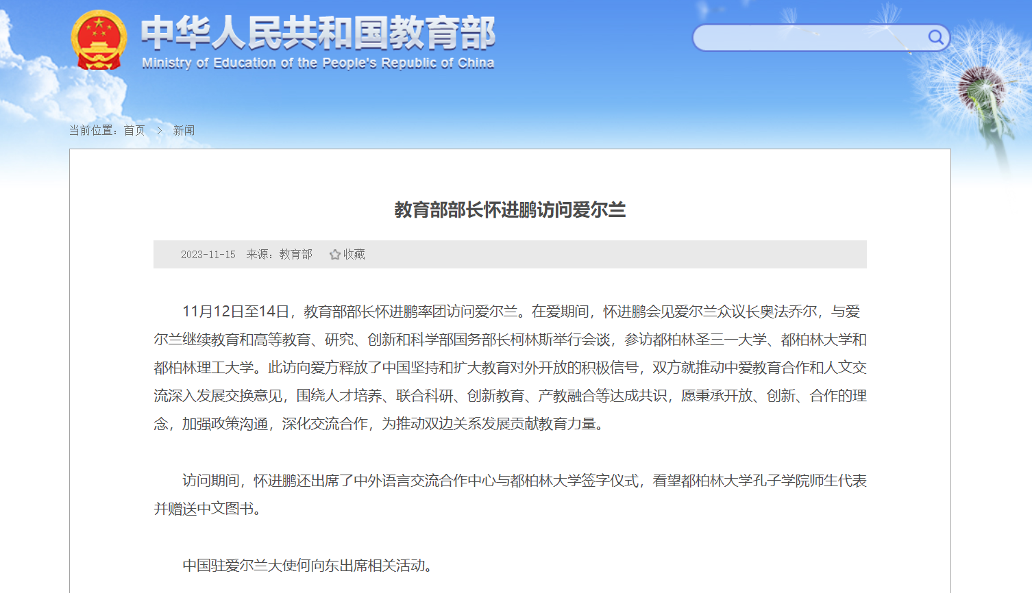 11月12日到14日,教育部部长怀进鹏率团访问爱尔兰。在爱期间,怀进鹏参访了我校合作办学院校都柏林大学。新闻报道链接如下://www.moe.gov.cn/jyb_xwfb/gzdt_gzdt/moe_1485/202311/t20231115_1090661.html