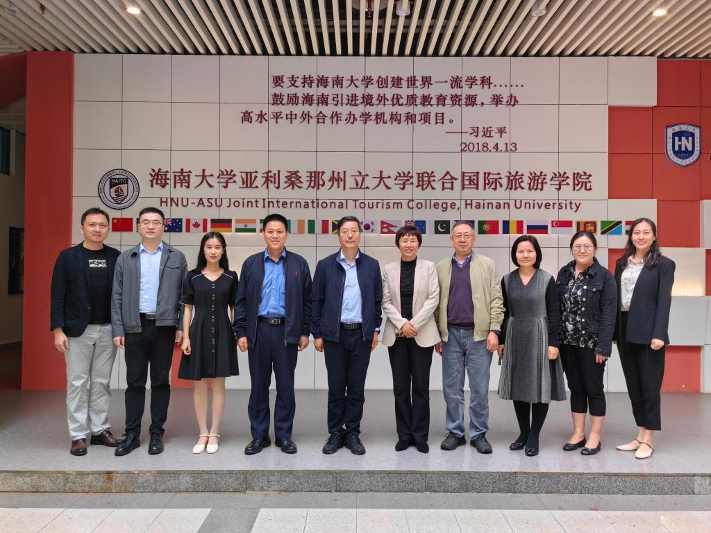 海南大学亚利桑那州立大学联合国际旅游学院院长王琳、副院长张仙锋等接待了汪海年一行。王琳对汪海年一行来访表示欢迎,并从办学政策指引、国际师资培育、教学科研促进等方面分享了国际旅游学院国际化发展的创新举措。汪海年对国际旅游学院的热情接待表示感谢,他通过助力学科建设、提升培养成效及发挥辐射效用等方面介绍了学院人才培养的实践与思考。双方就教务教学管理、国际交流拓展和基础设施建设等关键环节进行了深入交流,并表示愿加强彼此间的互学互鉴,共同助力国际化人才培养高质量发展。