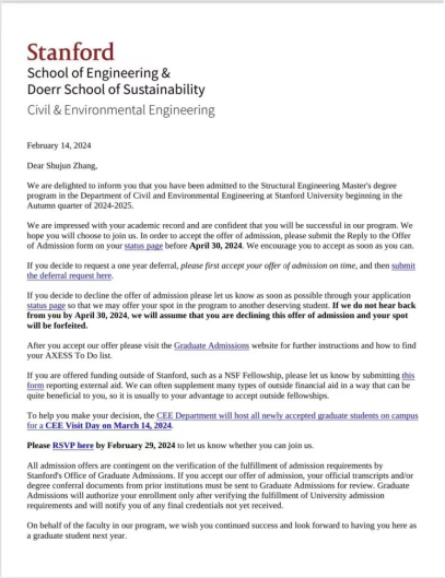 张舒峻同学于本科期间多次获得院校级奖项,曾担任创新实践子计划负责人,参与大创省级项目、清华大学线上科研项目等并顺利发表论文。张舒峻同学获得斯坦福大学土木与环境工程系结构工程硕士专业的录取,充分证明了他在学术和个人素质方面的出色表现。