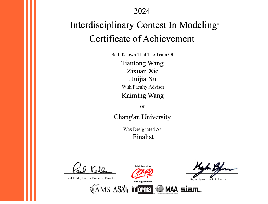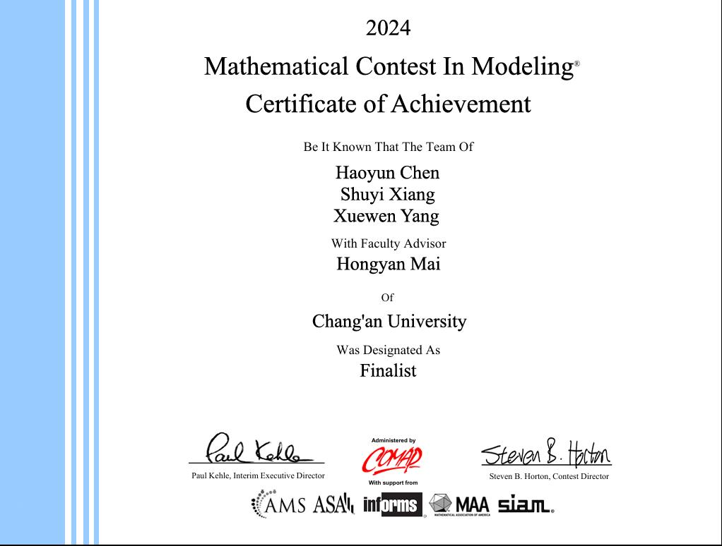 学生获特等提名奖(Finalist)3项、国际一等奖(Meritorious Winners)3项、国际二等奖(Honorable Mention)9项。