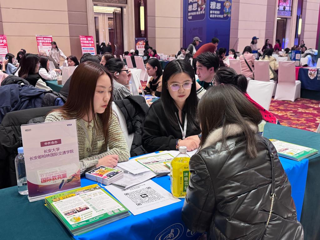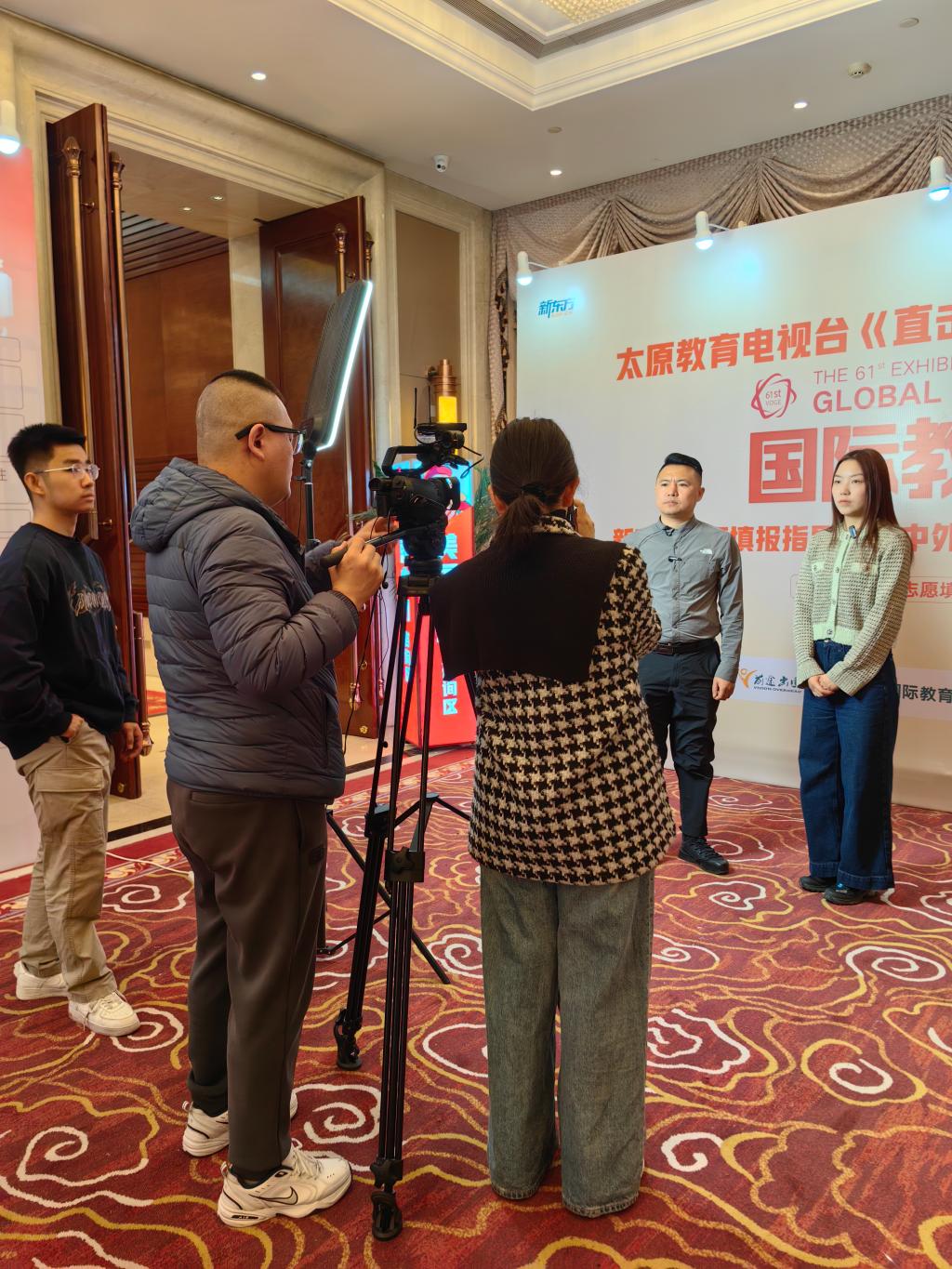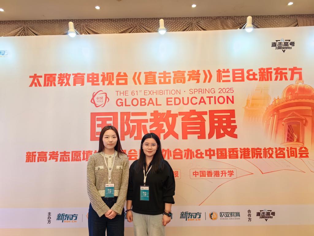 陈鹿姿、崔璐参加了由太原教育电视台主办的山西省第二届“新高考+”多元升学规划说明会暨2025国际教育展。此次活动汇聚了新加坡南洋理工大学、香港浸会大学、温州肯恩大学等近五十所国内外知名院校,吸引了山西省近千名家长和高中学生参与。