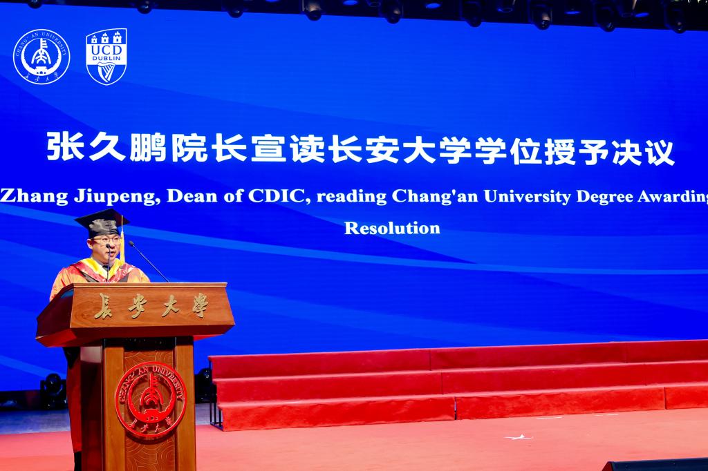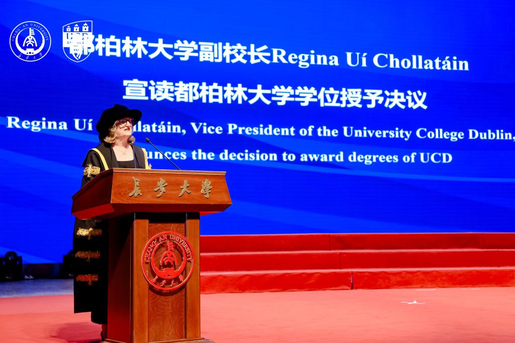 在学位授予环节,Regina Uí Chollatáin教授授予都柏林大学学位,张久鹏宣读91视频