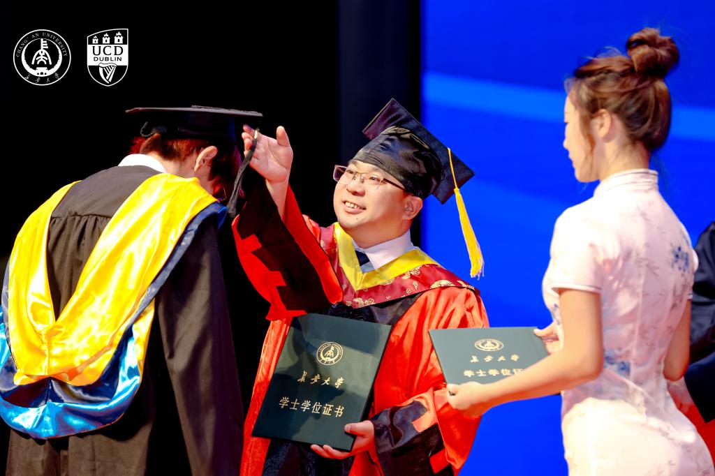举行2025届毕业生中外学位联合授予仪式暨毕业典礼。都柏林大学副校长兼人文与艺术学部主任Regina Uí Chollatáin、两校相关部门和学院专业负责人、双方教师代表、学院全体教职工、2025届毕业生及亲友参加了本次活动。学位授予仪式由学院教务长Paul Fanning主持,典礼环节由学院党总支书记赵亮主持。