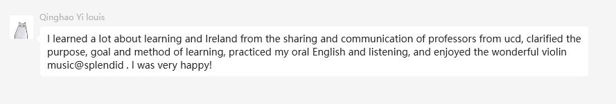 本次师生英文对话活动内容丰富,为同学们带来了与不同国家外教用英文交流的机会,有助于大家提高英语听力和口语水平,进一步了解爱尔兰文化,拓宽自身国际视野。参与学生们对本次活动反馈良好,纷纷在微信群里分享了活动参与感受。