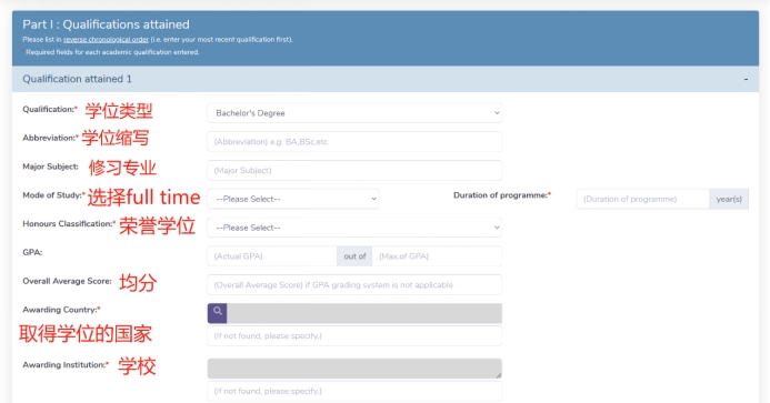 注意,如果你已经毕业了就在Part I:Qualifications attained这里填