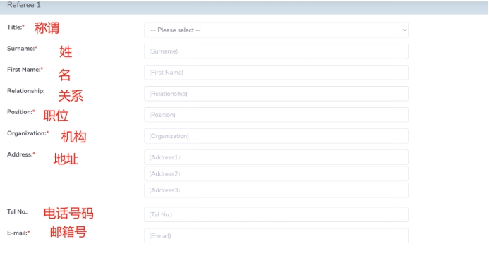 Academic/Professional referees进入推荐人信息填写页面,需要两位推荐人老师