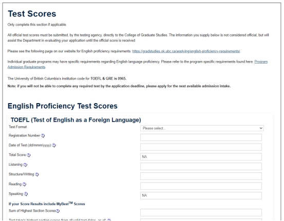 下一步,填写语言考试成绩(雅思或者托福)填写你的各项分数,你的单项最高分和它们的考试日期。