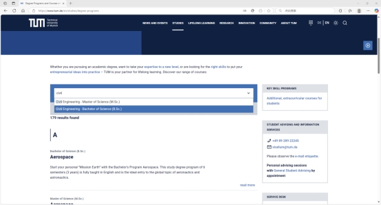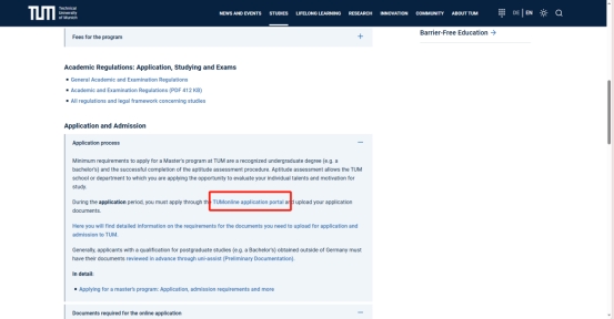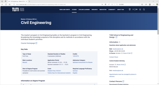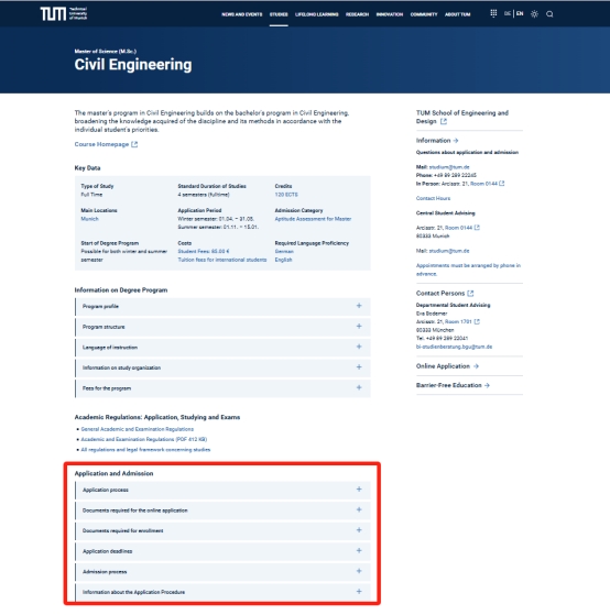 TUM的申请步骤在每个项目下附有详细的教程,只需要一步步按照教程界面的要求填写相关信息即可。以下以土木工程理学硕士学位为例: