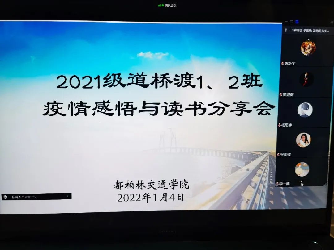 目前,西安疫情防控迎来了总攻关键时刻,为了减少同学们焦虑紧张的心情,帮助同学们维持良好的心态,2021级道路桥梁与渡河工程一班和二班于2022年1月4日,召开了由班主任王世超老师主持的《疫情感悟与读书分享会》线上主题班会。