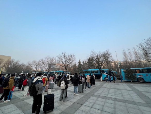 天虽尚寒,心已向暖。1月17日凌晨4点,外省学生两站一场(火车站、高铁站、飞机场)转运工作如期开启。寒风刺骨,辅导员的叮嘱、志愿者的坚守,却让同学们内心深处感到格外温暖。校园里行李箱拖曳的声音此起彼伏,一辆辆大巴车在车站和校园间穿梭,将寒意全然冲散。