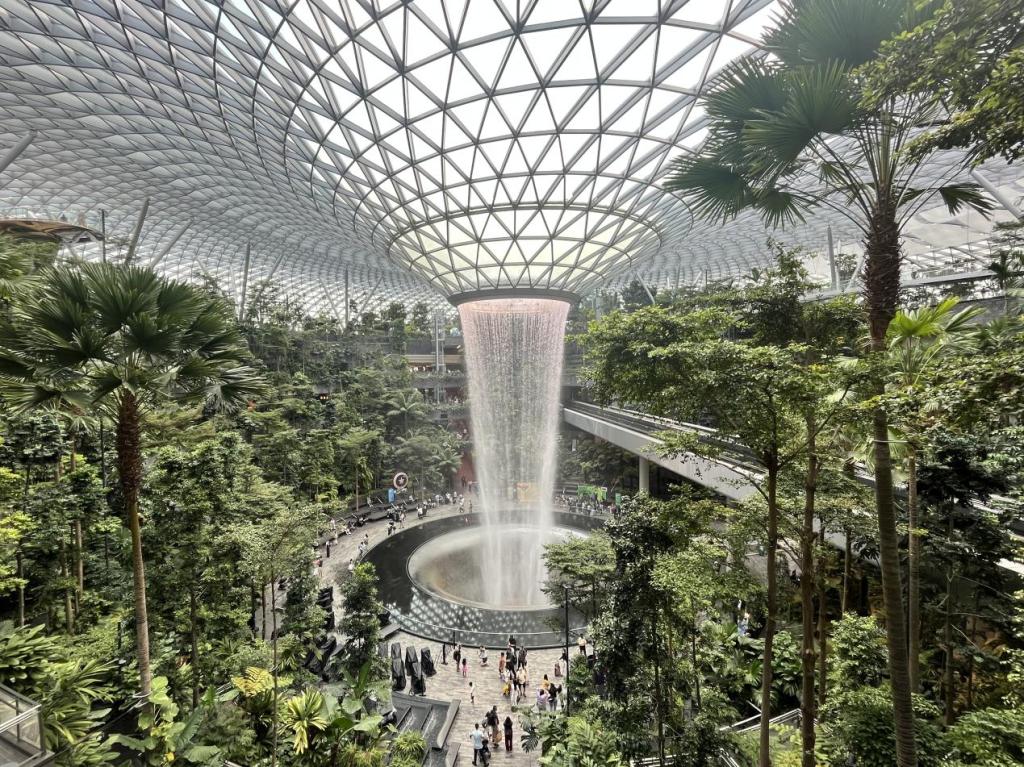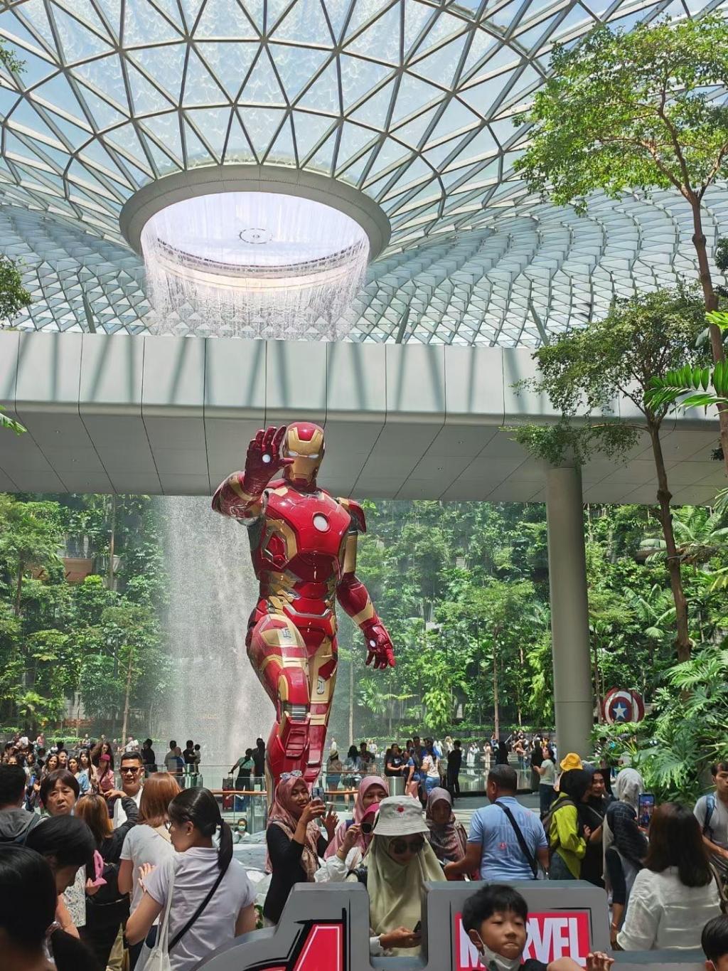 抵达机场后,研学团体验了有“全球最美机场”之称的“星耀樟宜”。“星耀樟宜”坐落于新加坡樟宜机场榜首航站楼前方,也是机场的中心方位,项目是一座集合航空设备、购物休闲、住宿餐饮、景观花园等多功能于一体的综合性建筑。这座世界最高的室内瀑布,无疑是“星耀樟宜”的一大亮点。人在室内就可以感受到瀑布的壮观景象,有一种身处大自然的新鲜感。目击高达40米的“雨漩涡”从7层高的穹顶上倾泻而下,同学们无不感叹项目设计者的异思妙想,大家纷纷拍照留念,定格美好的瞬间。