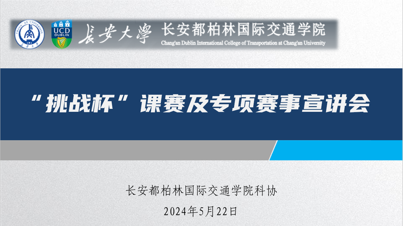 为深入贯彻党的二十大精神,落实科教兴国战略、人才强国战略、创新驱动发展战略,进一步培养我校学生努力培养科学精神和科学态度,积极学习科学知识和科学方法,调动学生参赛热情,引导学生提前做好参赛准备,5月22日,长安都柏林国交交通学院在鸿远教学楼WH1406教室举办“挑战杯”课赛立项及专项赛事宣讲会。学院科协指导教师曹胡杨及科协主席团成员参与了此次活动。
