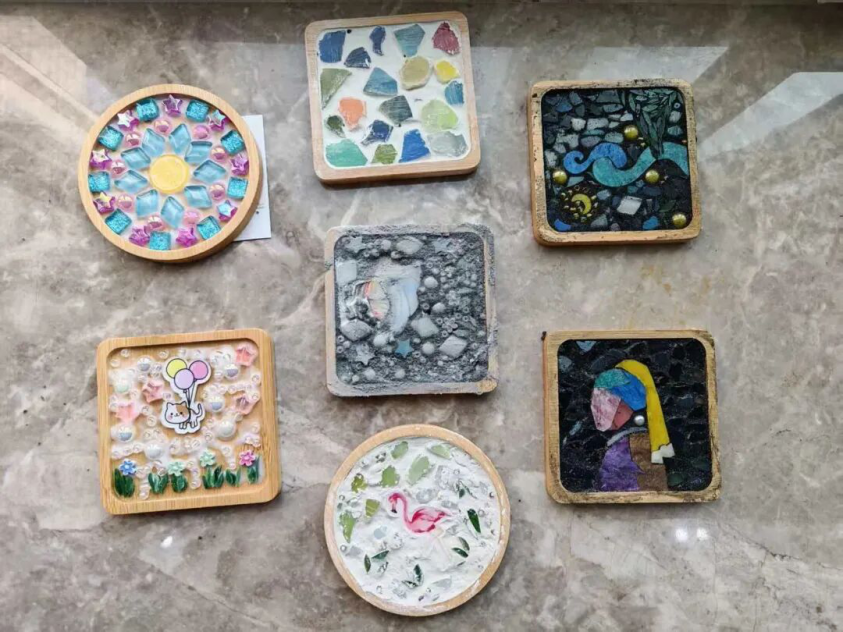彩虹心理协会精心准备了30余个马赛克杯垫材料包,涵盖约十种不同图案,并为参与同学配备了专用胶水、填缝剂及全套辅助工具。在学院心协负责人的细致讲解和示范下,同学们认真了解制作流程,依次完成图案拼贴、缝隙填充和表面清理等步骤。五彩斑斓的马赛克片在指尖灵活组合,一件件独具匠心、风格各异的杯垫作品逐渐成形,展现出同学们丰富的想象力与创造力。