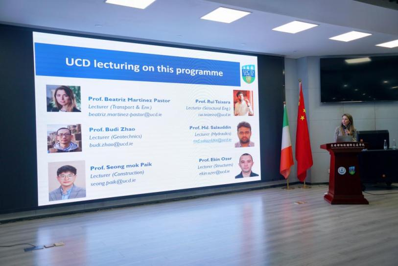 在渭水校区鸿远教学楼四楼报告厅举办了中外合作办学2023级道路桥梁与渡河工程专业新生都柏林大学教授讲专业活动。都柏林大学道路桥梁与渡河工程外方专业负责人Beatriz Martinez Pastor教授线下参与了本次活动。